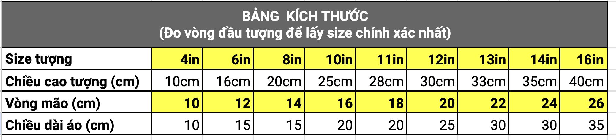 SIZE TÍNH THEO SỐ ĐO VÒNG ĐẦU TƯỢNG