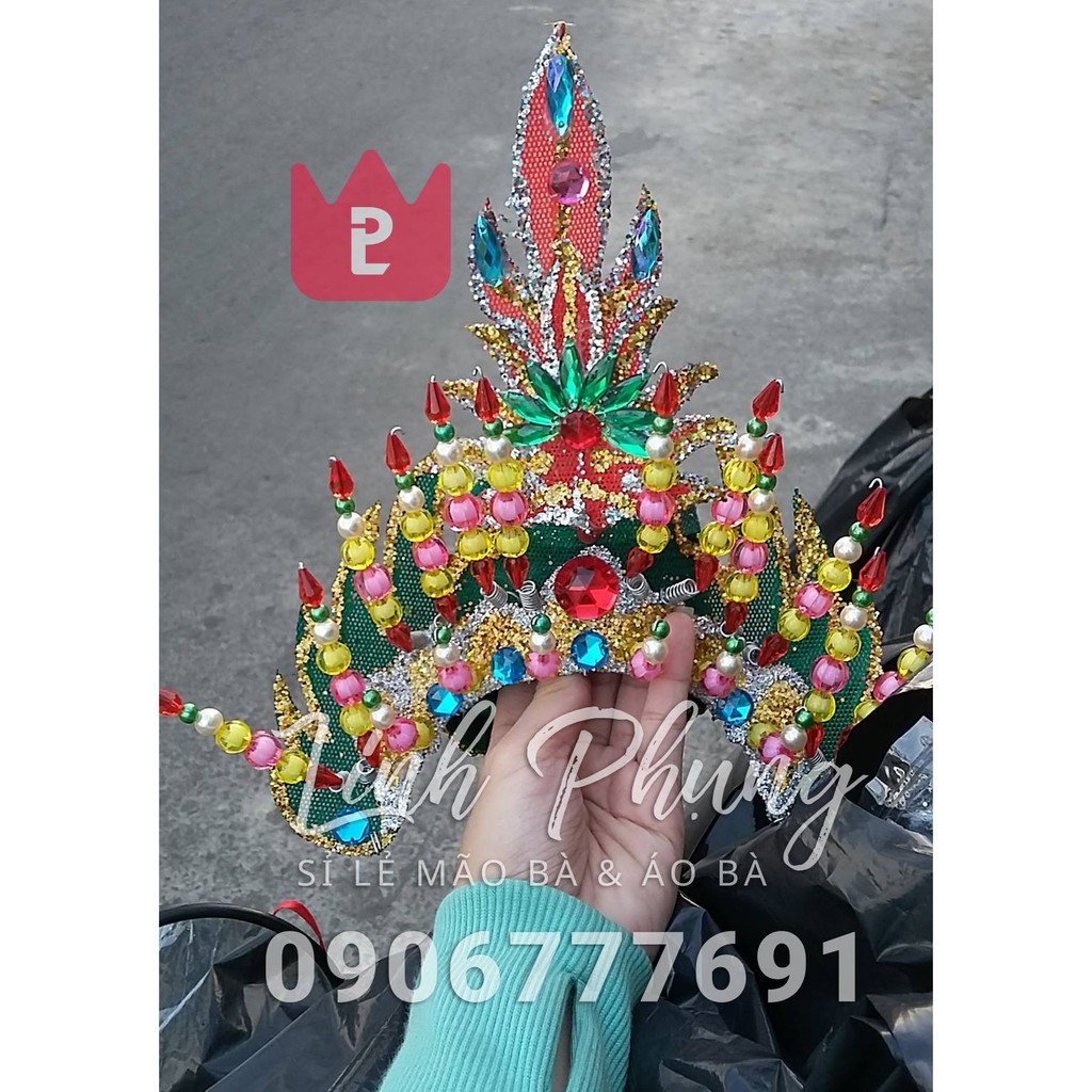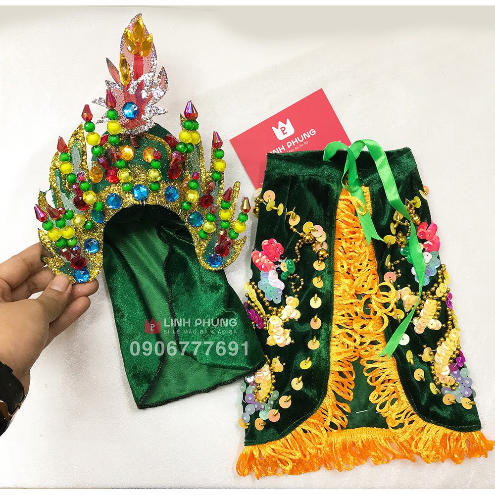 BỘ SẢN PHẨM GỒM: 1 áo choàng + 1 mão đội Chất liệu: áo choàng vải nhung, mão khung lưới kẻm dẻo đính hột Màu áo mão mặc định: + Quan Thánh : xanh lá + Quan Bình: vàng + Châu Xương: xanh dương