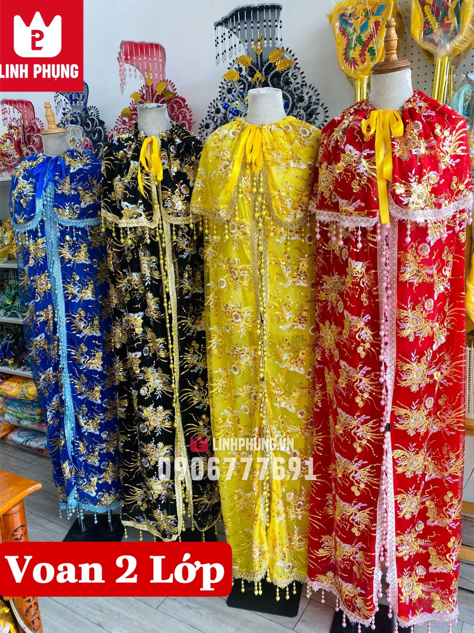 Chất liệu vải voan, đa đạng màu phù hợp cho tất cả tượng (mẹ Quan Âm, Kim Mẫu, Diêu trì Địa Mẫu, Ngũ Hành, Tam Tòa Thánh Mẫu, Thiên Hậu, Linh Sơn v.v...)